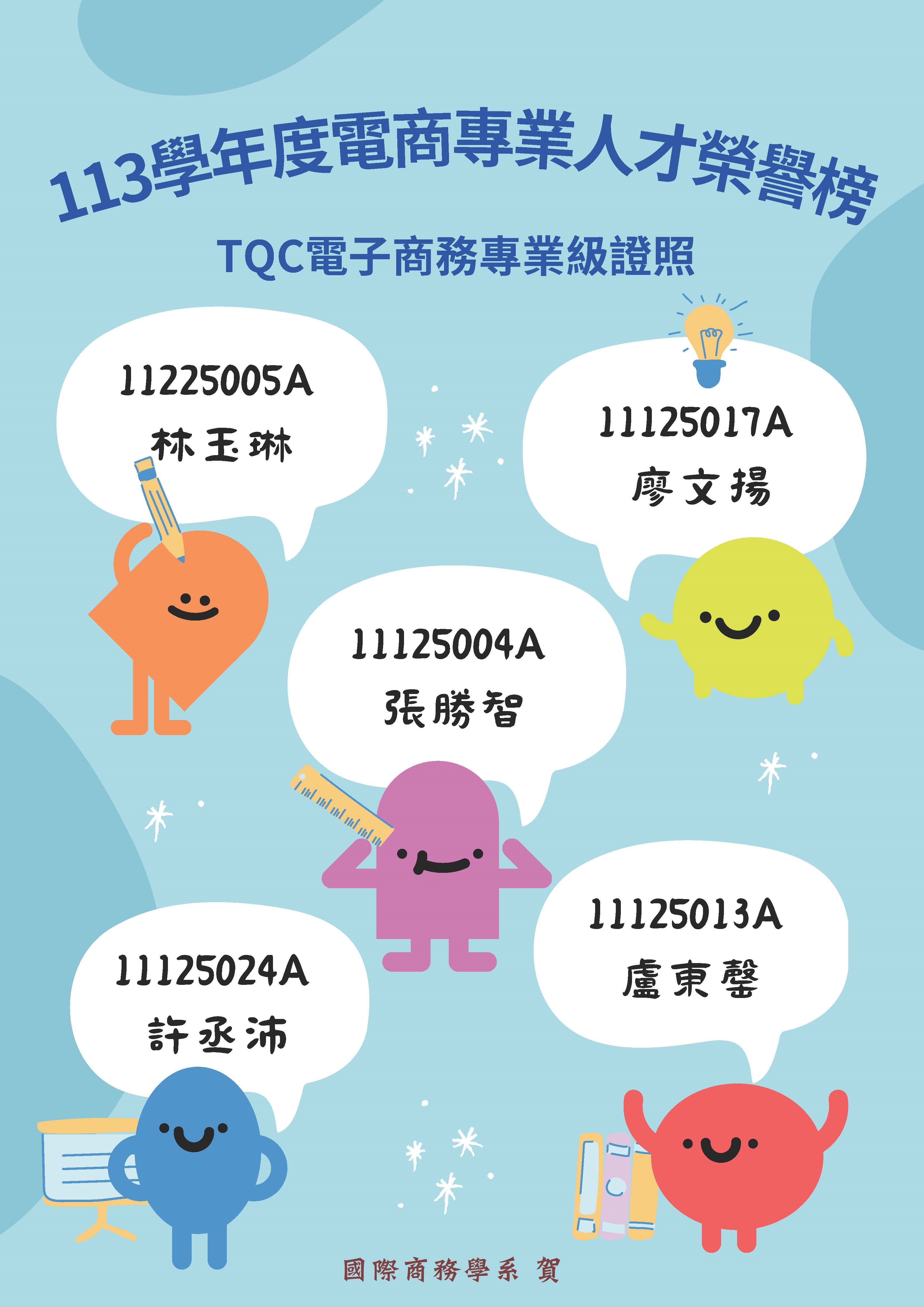 ● 本系113-2共5位同學通過TQC「電子商務概論」專業級證照。