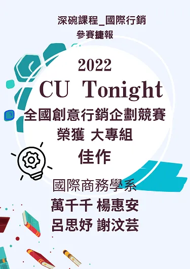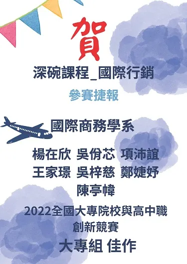 本課程以大二必修課 「 行銷管理」為淺碗基礎,將小組工作坊創思點子雛型.在循序漸進的自主學習單元中,各組活用行銷策略4P和4C ·加深創意產品,挑戰完成可參加行銷競賽的深碗作品。本課程具備有同儕學習討論及 自主學習空間,各組藉由討論與反饋,提升學生主動學習動機與知識承載度。老師的角色轉移成引導的配角.透過知識啟發與學習技巧,確保具體的學習成果。 學生以深碗作品參加校外競賽,得獎捷報再創新高。
